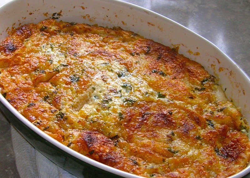 Zuppa Gallurese: layered bread with Peretta cheese, parsley, nutmeg and broth.