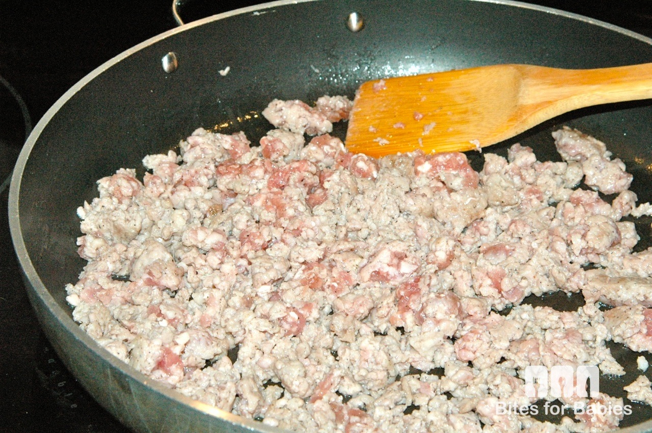 In the meantime, heat the oil on medium heat in a large saucepan for 1-2 minutes. Add the garlic and saute for another 2 minutes. (If halved, don’t forget to remove before serving!). Squeeze the sausage out of the casing directly into the pan. Saute for about 7 minutes, breaking apart into smaller pieces with a wooden spoon or spatula as it cooks.